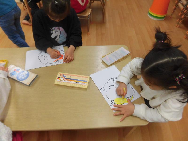 1組は節分に向けて鬼のお面にクレヨンで色を塗りました!お面を見せると指を差しながら「おに!」と反応を見せて、自分達の好きな色のクレヨンで色塗りを楽しんでいました!その後は園庭に出て水道の中にあった氷を見つけて触ってみたりと冬ならではの遊びをしていました♡
