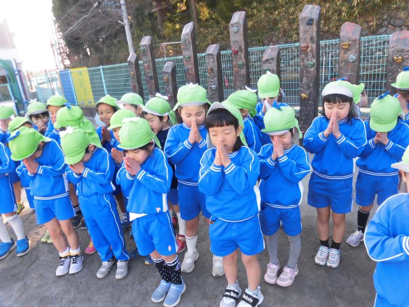 ■燃やし始めに青竹がはぜて「どんっ」と音がするから など諸説あり、音の響きからついたようです。 ■お餅やお団子を火で焼いて食べる ⇒1年間健康に過ごせる 子ども達は火を見て手を合わせていました! そしてお餅を食べて「おいしー」と言ってお友達と話しをしていました! ぞう組は鏡開きを行ないました! 無病息災を願い子ども達もお餅が割れると驚いていました(*'ω'*) 松田