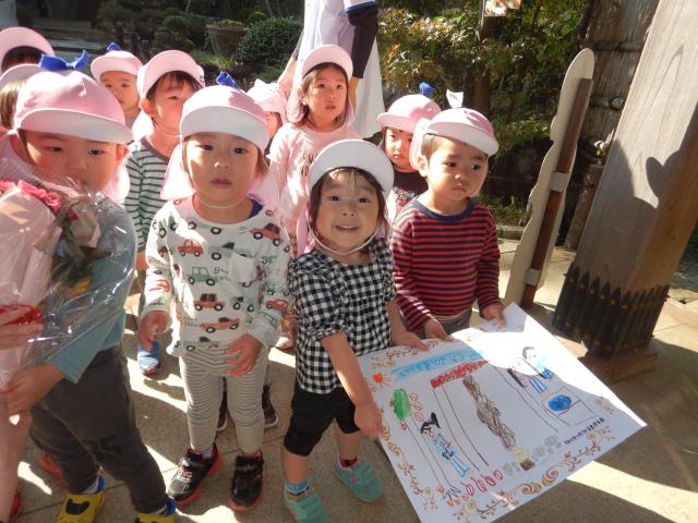 今日は勤労感謝のプレゼントを狭山公民館に渡しに行きました♪お花とぞう組が描いてくれた絵をプレゼントしました。大きな声で挨拶をすることが出来ましたよ(#^.^#)