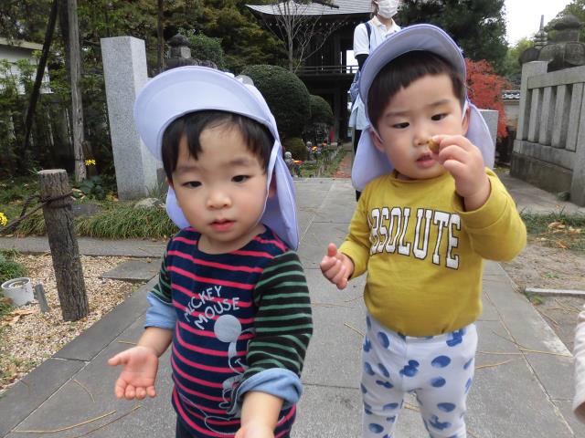 円乗院へ向かう道や、保育園の周りには落ち葉やどんぐりがたくさん落ちていて、地面を見ながら歩いたり、両手いっぱいに集めている子どもたちでした!