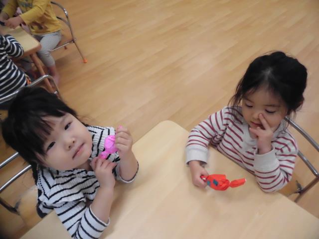 玩具、スプーンやフォーク等の食具の他、クレヨン等様々な道具に触れ、物を握る、使う事に少しずつ慣れてきています。