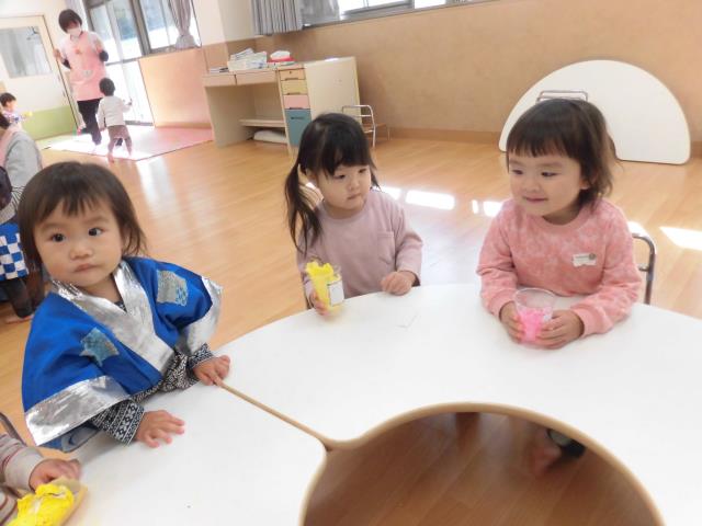 今日はあひる組、ぞう組の模倣遊びの様子を見学させてもらい、新聞紙で作ったたこ焼きやお花紙で作ったジュースを手に取り「あーん」と食べる真似!異年齢児とも触れ合う事が出来ました。